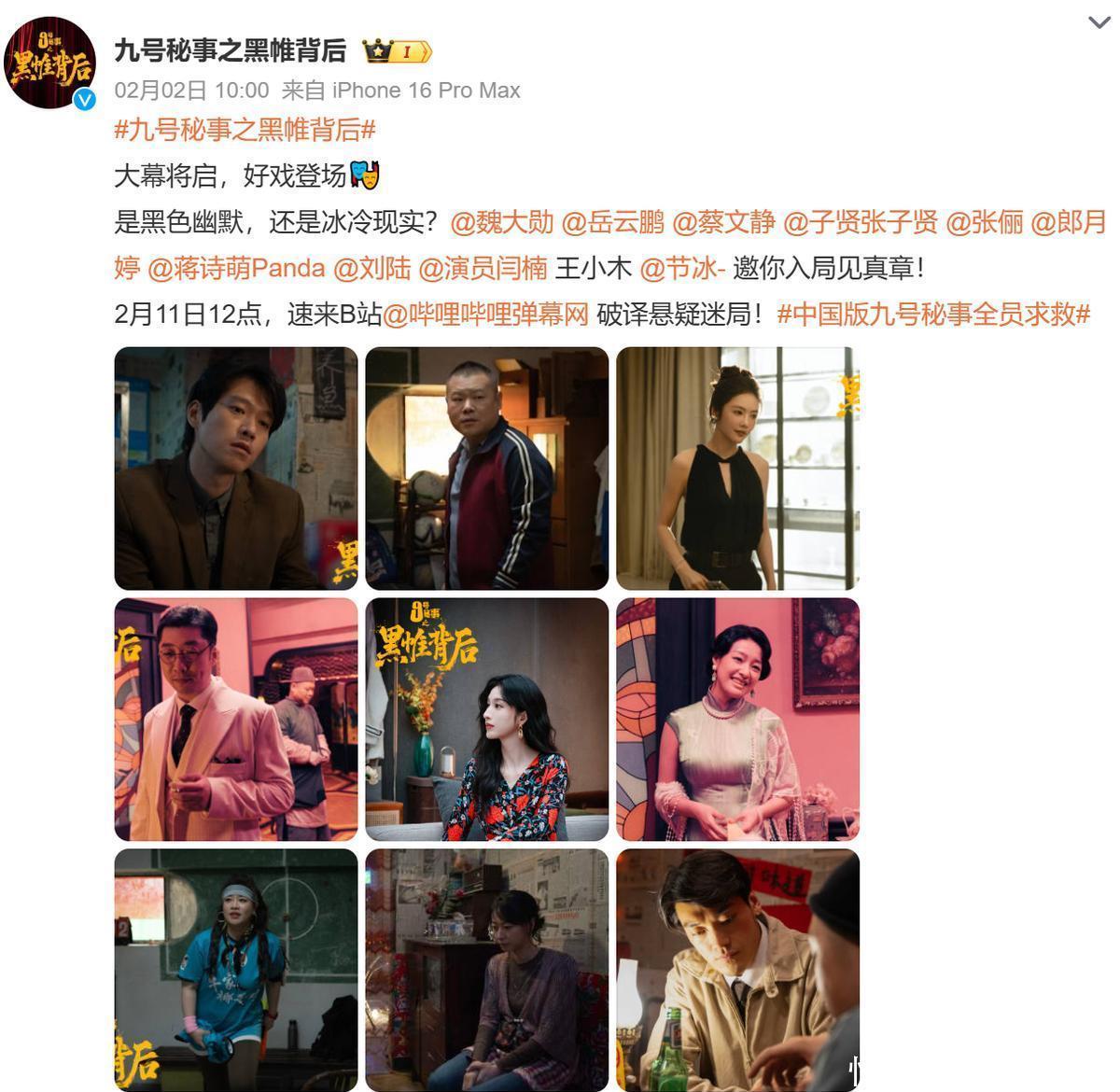不过啊,眼下最解馋的还得是马上要来的《九号秘事之黑帷背后》。这部剧2月11号就在B站开播,才7集,每集十几二十分钟,短小精悍得让人没法分心干别的。它可是正儿八经从中英共创那儿来的,BBC深度参与,黄晓明亲自下场当总出品人,本土化做得还挺巧妙,把原版那种密闭空间里的人性博弈和黑色幽默,跟咱们的职场、家庭话题揉在了一块儿,看着既新鲜又亲切。